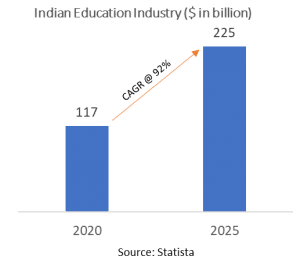 India has been witnessing different education systems starting from Gurukuls in the ancient period to the school and college education in the modern era. There has always been a change as the industry grows. The global education industry market size is valued at $ 3,300 billion in 2020 and is expected to witness a compound annual growth rate (CAGR) of 18% from 2021 to 2023. The Indian market size is valued at $117 billion in 2020 and is estimated to reach $225 billion in 2025 with a 92% CAGR. Factors for growth